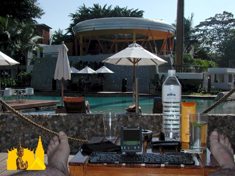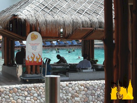if we were hungry, a little wave to the swim-up bar would summon a waitress and we would place our orders of satay, spring rolls, crab cakes, or what ever we felt like snacking on. it's good to be the king!