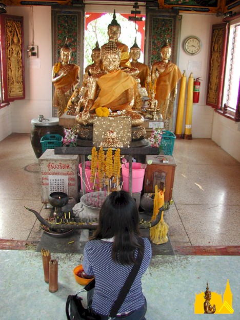 i found the girls wandering around at the top. i asked song if she wanted to make merit, and she eagerly nodded yes. i gave song some baht and she came back with a merit kit (blossom, incense, candle, and rubbing gold) for each of us, and passed them out. i?e done this a couple of times before so i? starting to get the hang of it. but like i always do; i move slowly and keep one eye on my guide just to be sure. of course there has to be a new wrinkle at the end of the ceremony; the shaker cup. after all of our offerings have been placed, we pick up a cup full of wooden sticks. after shaking the cup for a few moments, an amazing thing happens; one of the wooden sticks will work its way up and out of the cup. the girls pick up the stick, note the number, and run off to get the fortune for that number. each fortune sheet had one? fate translated into 4 or 5 languages. song and hah thought my fortune was a bad one. according to those two, if one receives a bad fortune they should leave it at the buddha statue.
